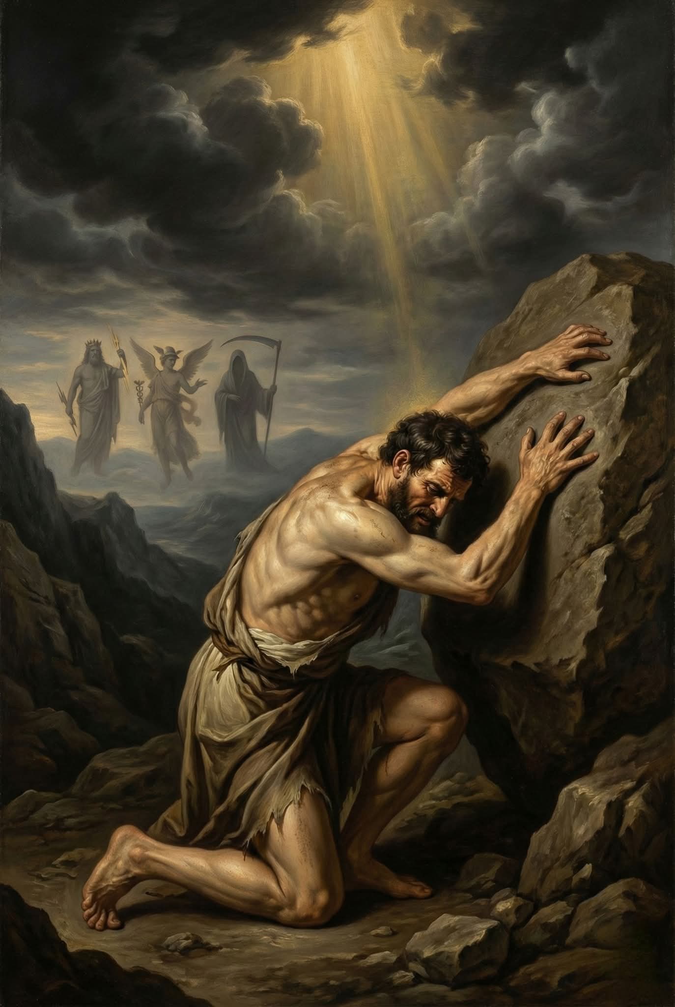 فجاء انتقام زيوس بارداً ومدروساً، مصمماً لتعذيبه وتحطيم روحه عبر العبثية المطلقة. ففي ظلمات “تارتاروس”، حُكم على سيزيف بدفع صخرة عملاقة صعوداً نحو قمة جبل شاهق الانحدار، مستنفداً كل ذرة من قوته وعزيمته، وهو يقترب ببطء شديد من القمة، ولكن في اللحظة الحاسمة التي يوشك فيها على الانتصار وتثبيت الصخرة، تفلت من يده بقوة خبيثة وتتدحرج مسرعة نحو قاع الوادي، ليقف سيزيف يراقب انهيار جهده بعينين فارغتين، قبل أن يضطر للهبوط خلفها ليبدأ المحاولة من جديد، محكوماً عليه للأبد بتكرار هذا العذاب اللامتناهي، حيث لا أمل في الراحة ولا جدوى من الجهد.