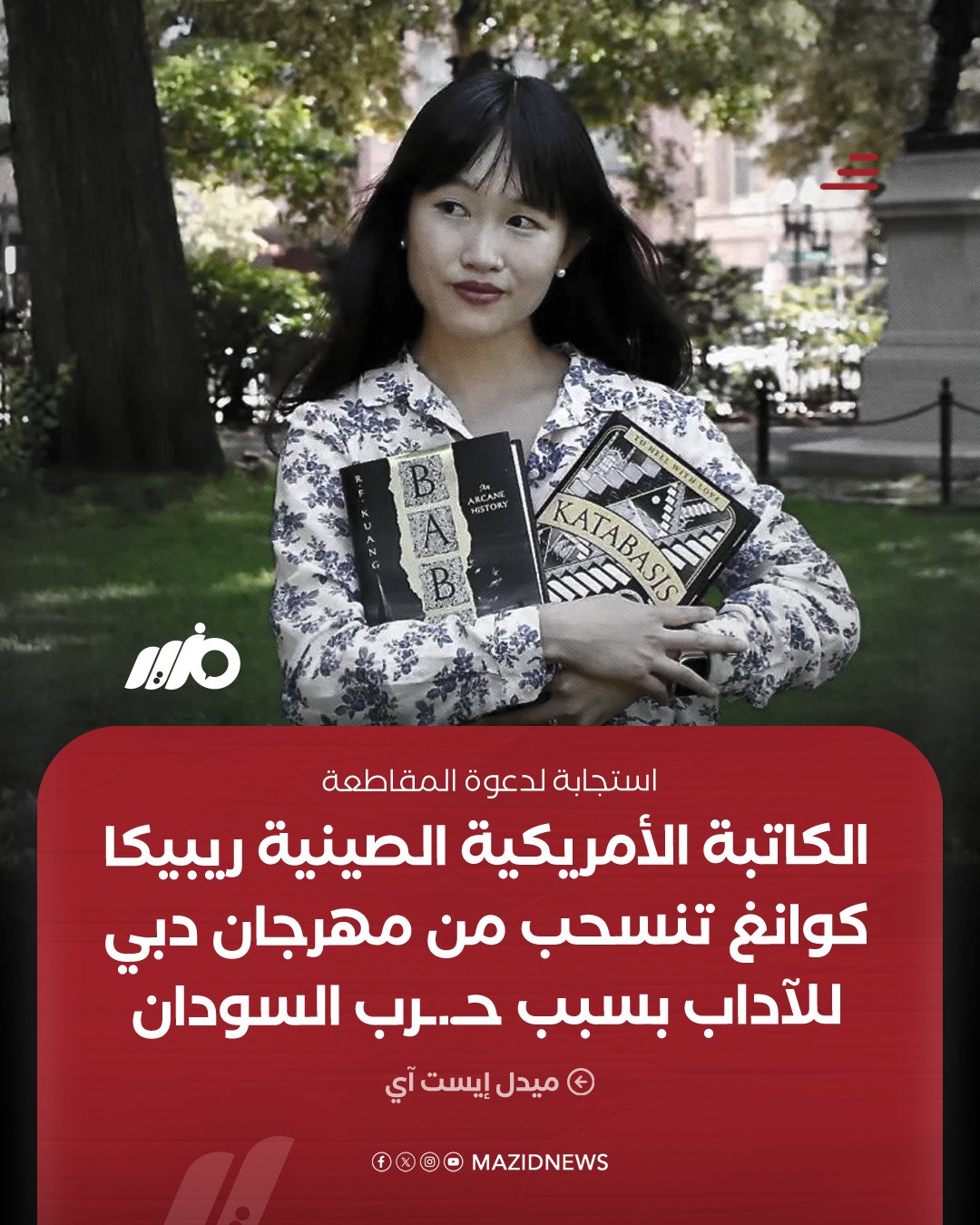 أعلنت الكاتبة الأمريكية الصينية الأصل ريبيكا كوانغ، انسحابها من مهرجان دبى للأدب بعد ما تم دعوتها لمهرجان، وقالت إن الأسباب متعلقة بدعوة “حركة المقاطعة الفلسطينية” لمقاطعة الإمارات بسبب تورطها في الفظائع التي في السودان. وحملتما وصفته بالعار  عبر حسابها الرسمى فى منصة x  الوسط العربي المتواطئ والمشارك في غسيل سمعة الإمارات والتغطية على جرايمها في المنطقة بطولها وعرضها.