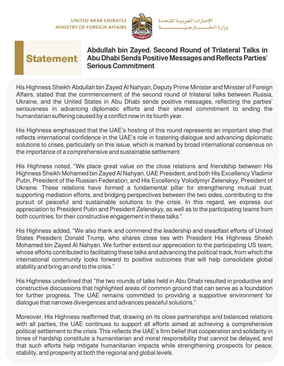 وقال معالي الشيخ عبد الله بن زايد آل نهيان، نائب رئيس مجلس الوزراء وزير الخارجية: “تُظهر الجولة الثانية من المحادثات بين وفود روسيا والولايات المتحدة وأوكرانيا في أبوظبي التزام المشاركين الجاد بالتوصل إلى حل دبلوماسي للأزمة الأوكرانية”.