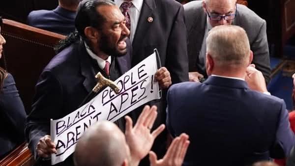 وظهر النائب خلال الخطاب وهو يرفع لافتة كتب عليها: “السود ليسوا قرودًا”، في رد على ما وصفه بالعنصرية المستمرة من ترامب تجاه أصحاب البشرة السمراء. تأتي هذه الخطوة على خلفية مقطع فيديو نشره ترامب على وسائل التواصل الاجتماعي، يظهر فيه الرئيس السابق باراك أوباما وزوجته ميشيل أوباما بطريقة مسيئة تشبه هيئة القرود.