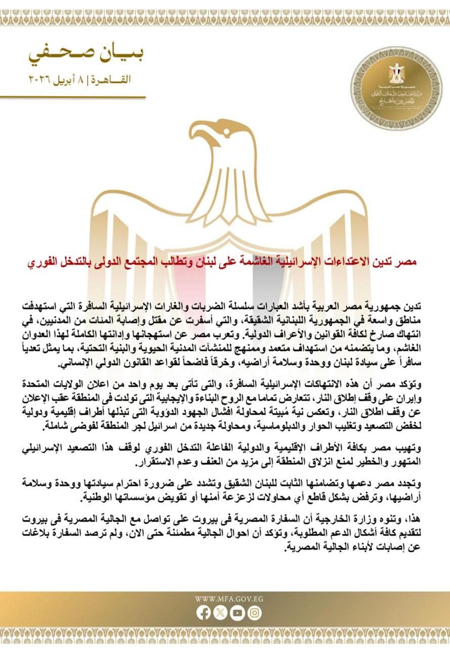 وتؤكد مصر أن هذه الانتهاكات الإسرائيلية السافرة، والتي تأتى بعد يوم واحد من إعلان الولايات المتحدة وإيران على وقف إطلاق النار، تتعارض تماما مع الروح البناءة والإيجابية التي تولدت في المنطقة عقب الإعلان عن وقف إطلاق النار، وتعكس نية مُبيتة لمحاولة إفشال الجهود الدؤوبة التي تبذلها أطراف إقليمية ودولية لخفض التصعيد وتغليب الحوار والدبلوماسية، ومحاولة جديدة من إسرائيل لجر المنطقة لفوضى شاملة.