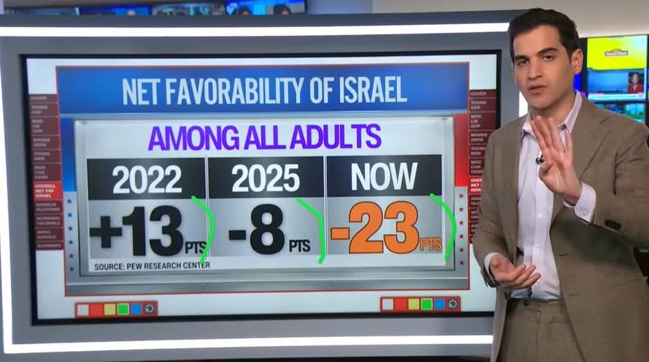 متابعةً على “القائمة السوداء” التي نشرتها وزارة الشتات الإسرائيلية لأسماء الشخصيات العشر ذات التأثير الأسوأ على صورة دولة الاحتلال لدى الرأي العام العالمي، لفتتني نتائج الاستطلاع الحديث الذي عرضته اليوم شبكة CNN الأمريكية، والذي يعكس تغيرات درامية في نظرة الأمريكيين، ويكشف عن تآكل متسارع في الدعم الشعبي لإسرائيل، ليس فقط داخل المعسكر الديمقراطي، بل أيضًا في أوساط الجمهوريين، بمن فيهم الشباب الذين طالما شكّلوا قاعدة صلبة لذلك الدعم.