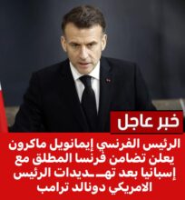 أعلن الرئيس الفرنسي إيمانويل ماكرون تضامن بلاده الكامل مع إسبانيا، عقب تهديدات أطلقها الرئيس الأمريكي السابق دونالد ترامب، في…